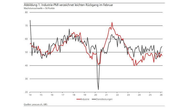 Der Einkaufsmanagerindex (PMI) ging im Februar um 1,4 Punkte auf 47,4 zurück und bleibt damit den 38. Monat in Folge unter der Wachstumsschwelle von 50 Punkten. Das geht aus dem aktuellen PMI hervor, den die Grossbank UBS zusammen mit dem Fachverband für Einkauf und Supply Management procure.ch monatlich erhebt.