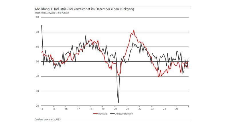 Der Einkaufsmanagerindex (PMI) notierte im Dezember 3,9 Punkte tiefer bei 45,8 Punkten und liegt somit seit genau drei Jahren unterhalb der Wachstumsschwelle von 50 Punkten, wie die UBS schreibt. Die Bank erhebt den PMI gemeinsam mit dem Fachverband für Einkauf und Supply Chain Management procure.ch. Die seit Januar 2023 anhaltende Durststrecke konnte trotz zwischenzeitlicher Erholungen im August 2024 (49,3 Punkte), Februar 2025 (49,6 Punkte) und November 2025 (49,7 Punkte) nie vollständig überwunden werden. Der PMI deute auf eine anhaltend angespannte Situation in der Industrie hin, schreibt die UBS.