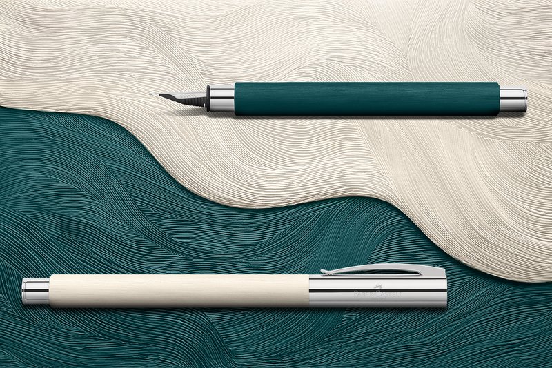 Für die besondere Aura sorgt das speziell bearbeitete Material: Der Schaft aus gebürstetem Edelharz vermittelt zum einen eine angenehme Haptik, die das Schreibgefühl intensiviert, zum anderen eine lebendige, natürliche Optik. Ein Effekt, der durch die Farben genial verstärkt: Cinematic White wirkt hochwertig, klar und inspirierend; Soft Teal ebenso harmonisch wie kreativitätsfördernd. Die Front- und Endstücke aus verchromtem Metall stehen zu beiden Tönen in reizvollem Kontrast. Beide Versionen umfassen jeweils Füllfederhalter, Drehkugelschreiber und Drehbleistift. Der Füller zeichnet sich durch eine hochwertige Edelstahlfeder aus, der Kugelschreiber ist mit einer schwarzen Großraummine in Schreibstärke B ausgestattet.