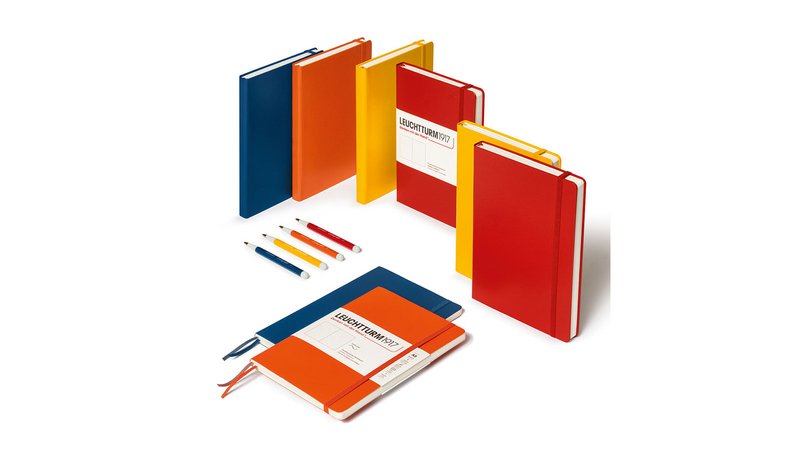 Die vier neuen Farben Indigo, Sunflower, Pumpkin und Cherry sind seit Oktober 2025 erhältlich als A5-Notizbuch als Hard- und Softcover. Auch der designprämierte Drehgriffel Nr. 1