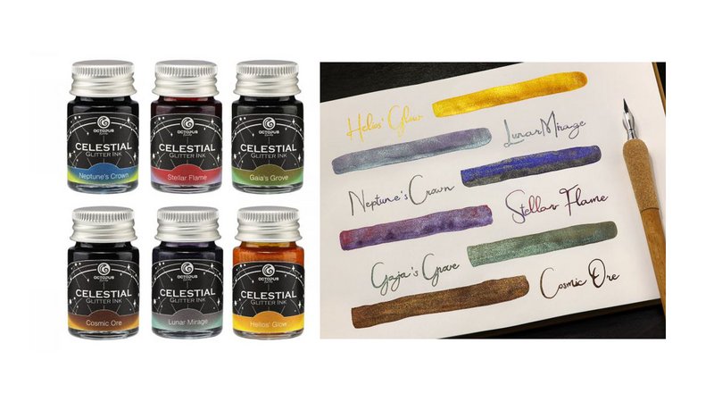 Die Octopus Celestial Collection verbinde intensive Farben mit feinsten Glitzerpigmenten und bringe einen besonderen Schimmer in die Handschrift, schreibt Octopus. Die sorgfältig abgestimmte Füllhaltertinte mit Glitzer sorgt laut Hersteller dafür, dass die Glitzerpigmente lange in der Tinte schweben und sich beim Schreiben gleichmäßig im Schriftbild verteilen. So entsteht ein stabiler Glitzer- und Schimmereffekt von der ersten bis zur letzten Zeile, ohne dass der Füllhalter ständig bewegt werden muss.